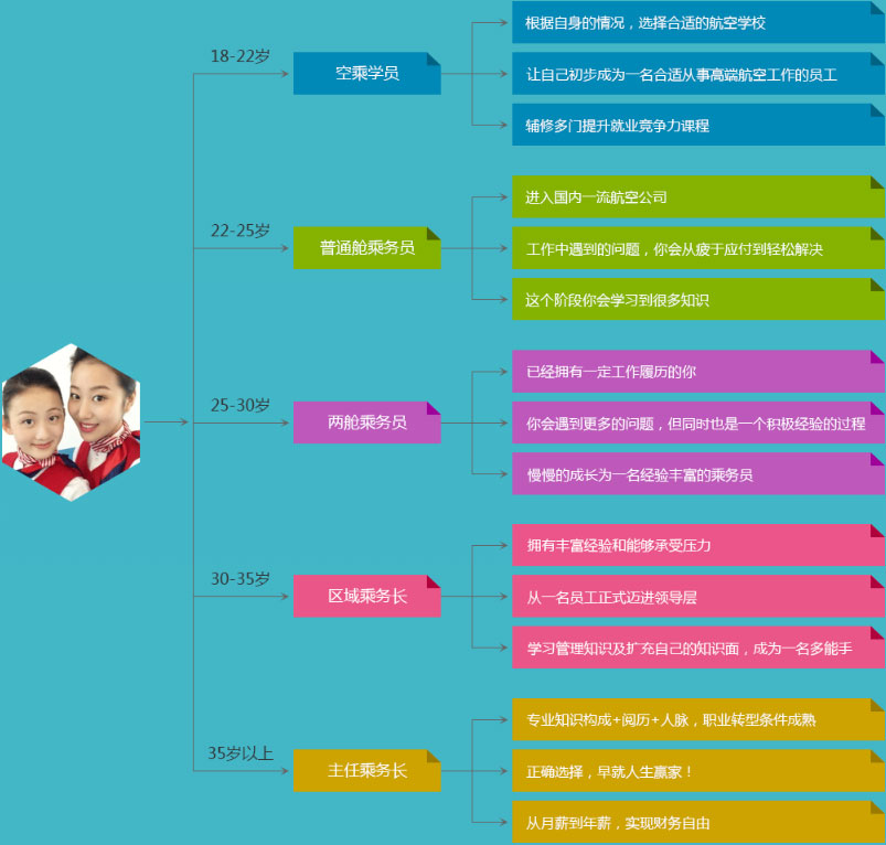 空姐的职业生涯可分为四个阶段:普通舱乘务员、两舱乘务员、区域乘务长、主任乘务长。一般学员在完成相应的业务培训后,可担当普通舱乘务员。随着飞行小时数的增加,个人资历的提升,通过相应的考核,可提升为两舱、头等舱乘务员。