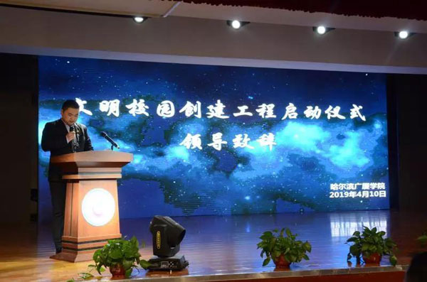 4月10日晚18时,“哈尔滨广厦学院文明校园创建工程”启动仪式在图书馆五楼报告厅举行。学校领导、学生工作处、后勤保卫处等部门领导及学生干部、二级学院学生代表共600人参加了本次活动。