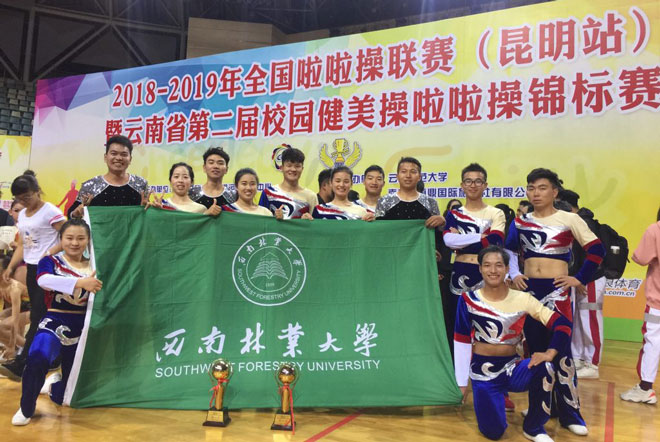 2018-2019年全国啦啦操联赛(云南站)暨云南省第二届校园健美操啦啦操锦标赛于11月9–11日在云南师范大学飞碟体育馆进行,我校健美操队参加了此次比赛体育院校组的比赛,经过两天的角逐,我校健美操队获得两个健美操项目冠军、一个啦啦操项目第四名的优异成绩,为学校取得了荣誉。同时教练员赵化斌老师获得“优秀教练员”的荣誉称号。