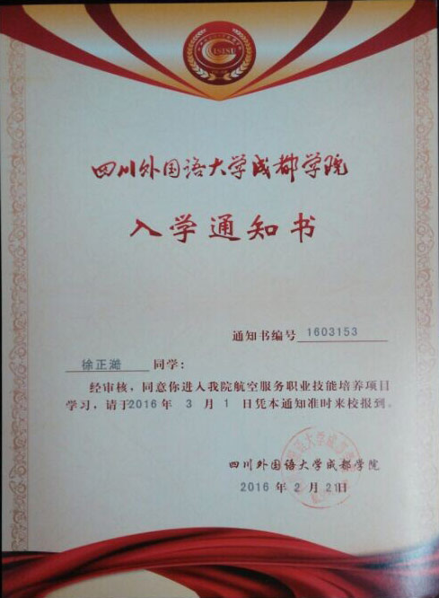 恭喜徐正澔同学被我校录取【川外成都航空】