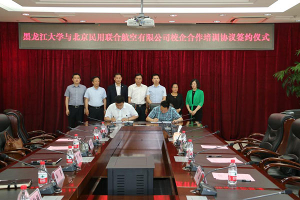 随后举行了黑龙江大学与北京民用联合航空有限公司的签约仪式。在与会人员的共同见证下,严明副校长与马少红副总经理分别代表双方签署了战略合作协议。这标志着黑龙江大学与北京民用联合航空有限公司建立起了全面的战略合作关系,双方将在进一步的交流融合中将发展优势、发展潜能、发展需求有机结合,必将取得突出的工作成效,进而产生具有里程碑式的积极意义。