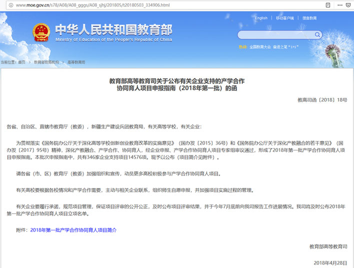 为贯彻落实《国务院办公厅关于深化高等学校创新创业教育改革的实施意见》(国办发〔2015〕36号)和《国务院办公厅关于深化产教融合的若干意见》(国办发〔2017〕95号)精神,深化产教融合、产学合作、协同育人,经企业申报、产学合作协同育人项目专家组审议通过,形成了2018年第一批产学合作协同育人项目申报指南。本批次申报指南中,共有346家企业支持项目14576项。现予以公布。请各省(市、区)教育厅(教委)加强组织和宣传,动员更多高校积极参与产学合作协同育人项目。有关高校要根据各校情况和产学合作需要,主动与相关企业联系,组织师生自愿申报,并加强项目实施过程的管理。有关企业要履行承诺,规范项目管理,保证项目评审的公开公正,及时公布项目评审结果,并于今年7月底前向我司报告工作进展情况。我司将及时公布2018年第一批产学合作协同育人项目立项名单。