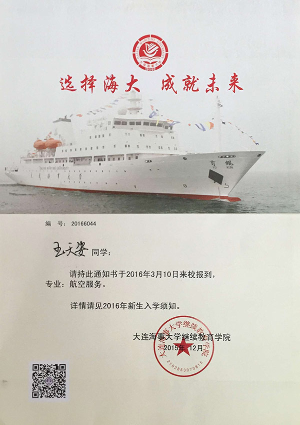 恭喜王天姿同学被我校录取【大连海事大学航空】