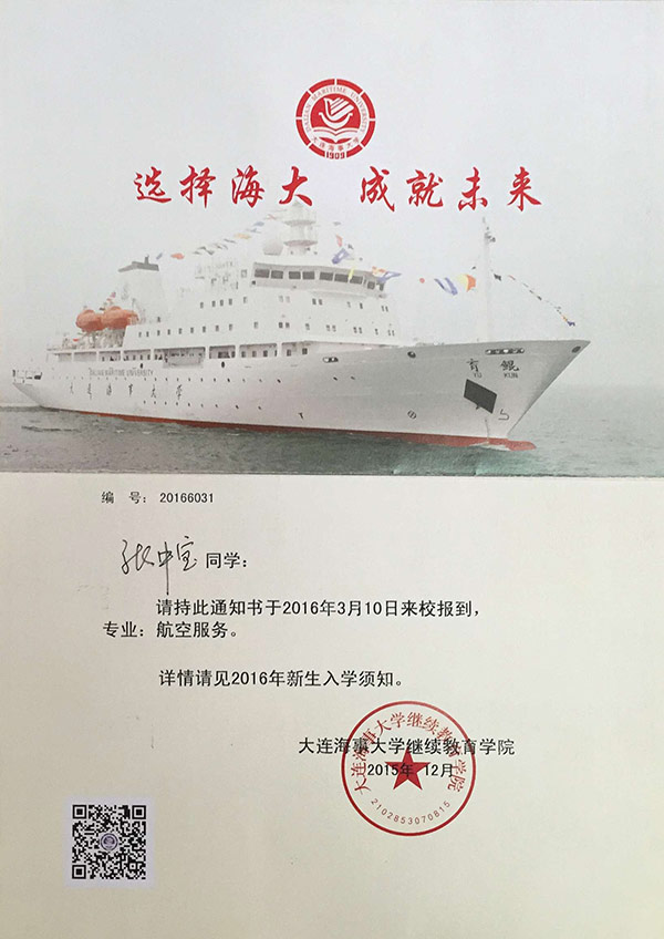 恭喜张中宝同学被我校录取【大连海事大学航空】