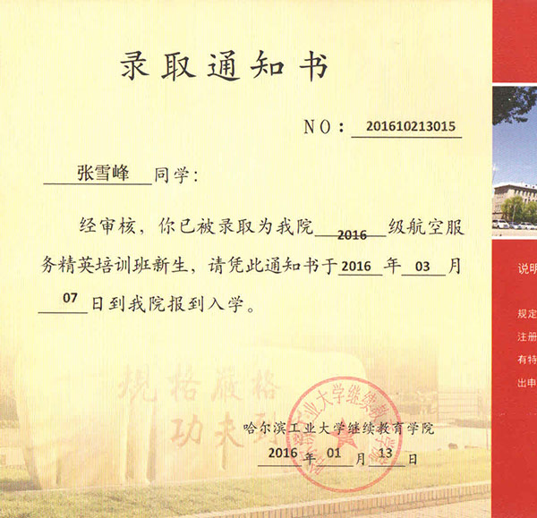 恭喜张雪峰同学被我校录取【哈工大航空】