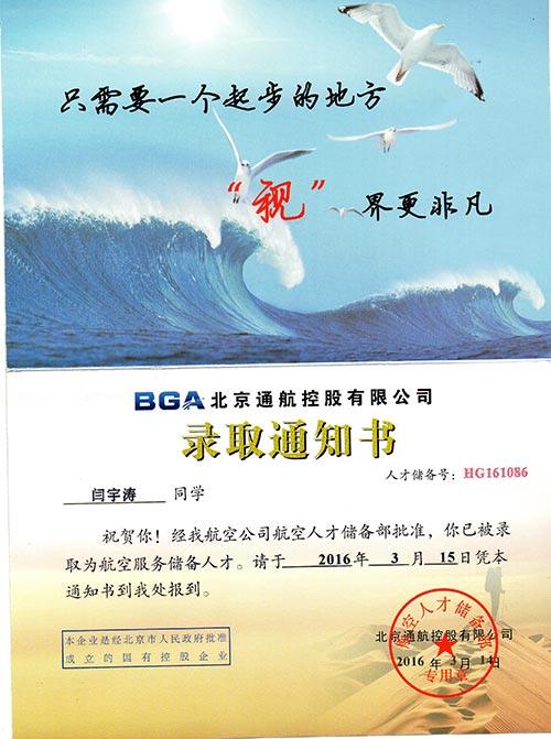 恭喜闫宇涛同学被我校录取【东海学院航空】