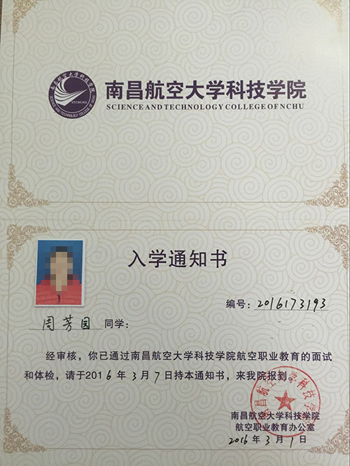 恭喜周芳园同学被我校录取【南航航空】